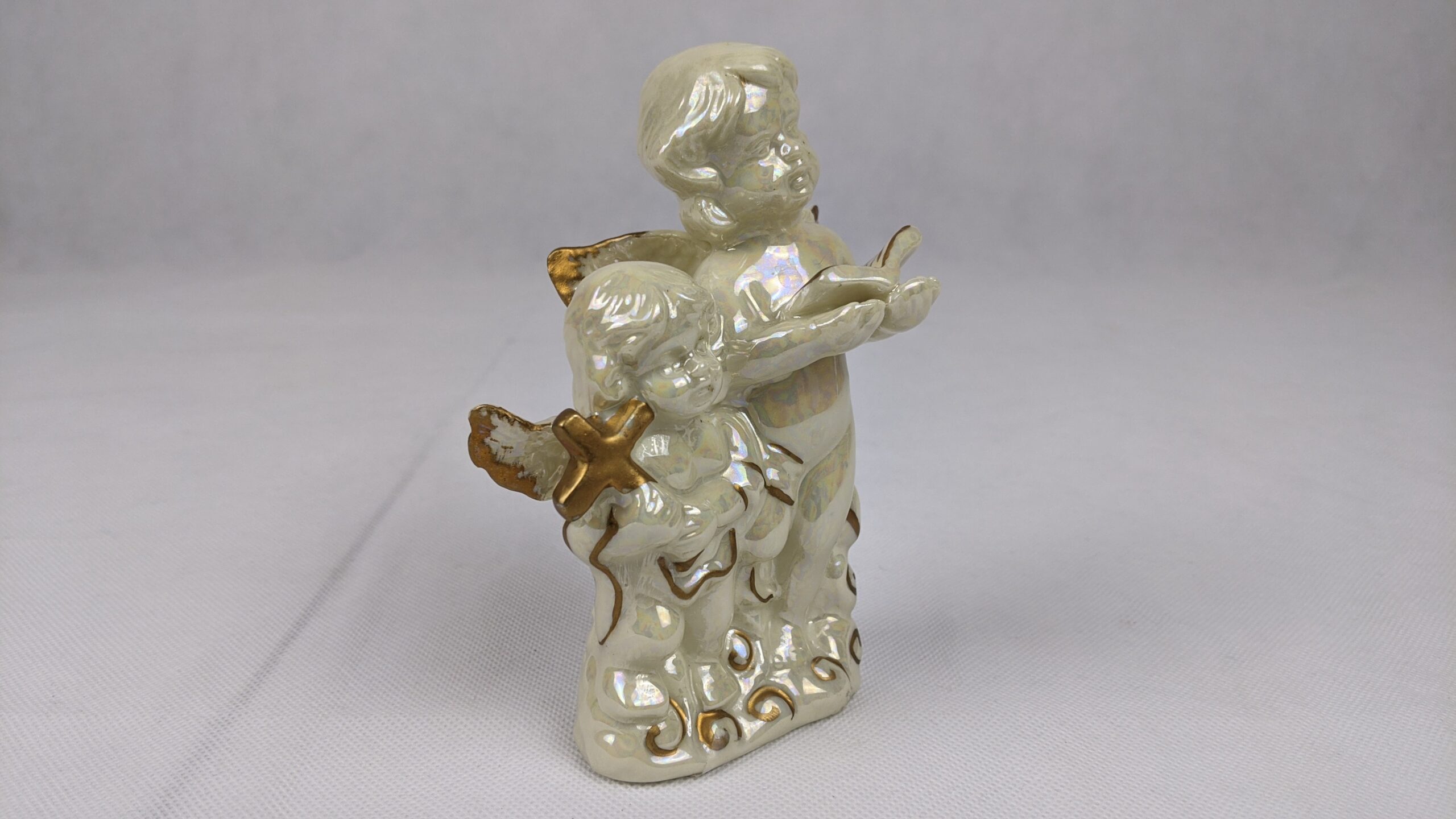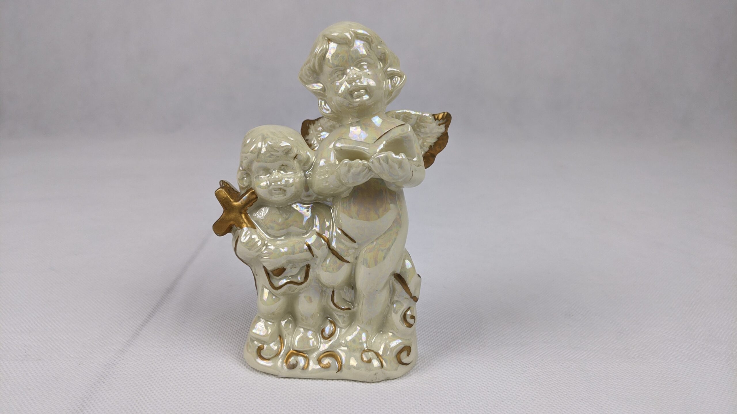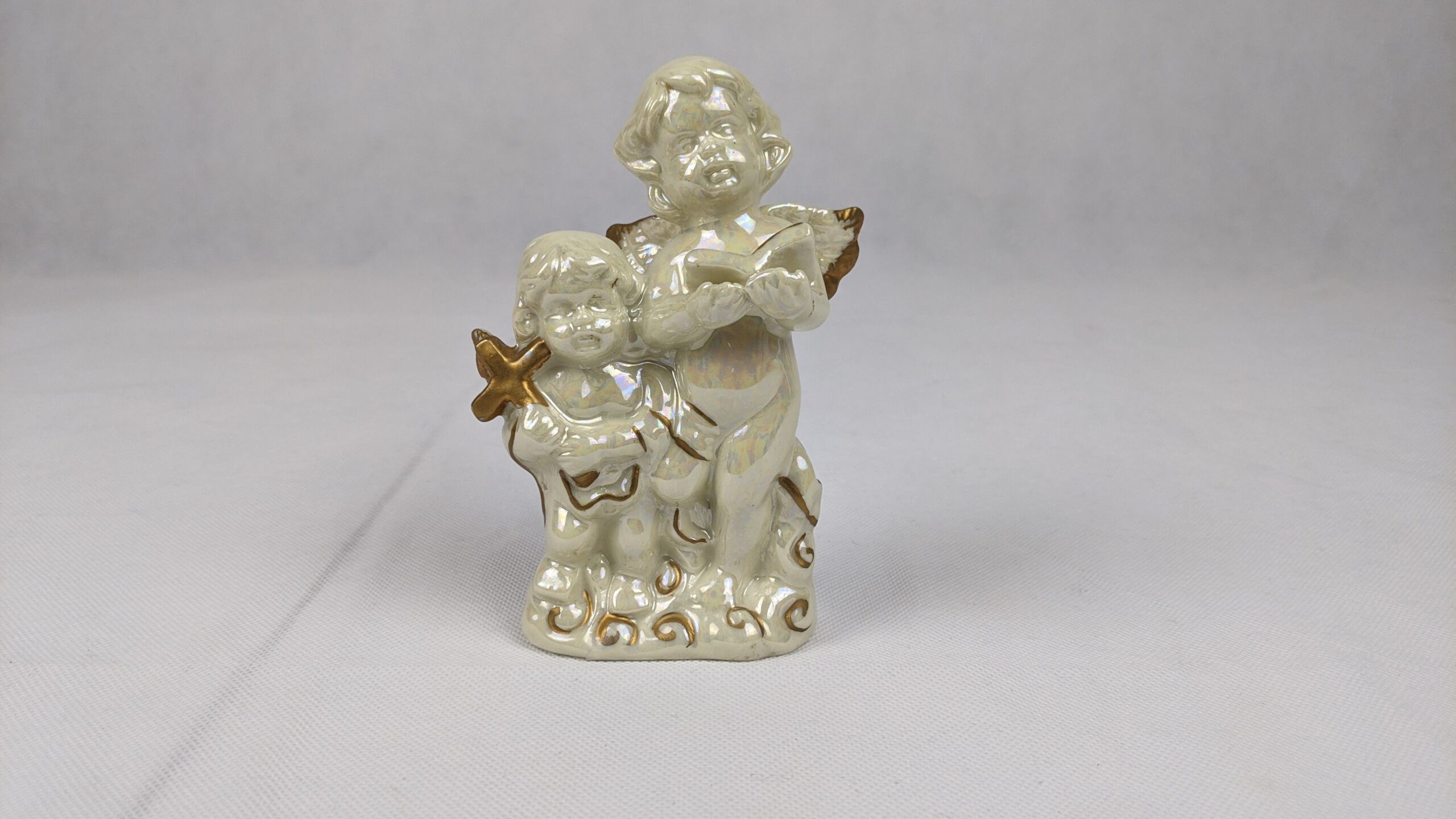 Glossy Angels Holding Bible & Cross is a very pretty item that has a lot of shine. It was a previously displayed item that is in good condition. It is approx. 5.25 inches tall.