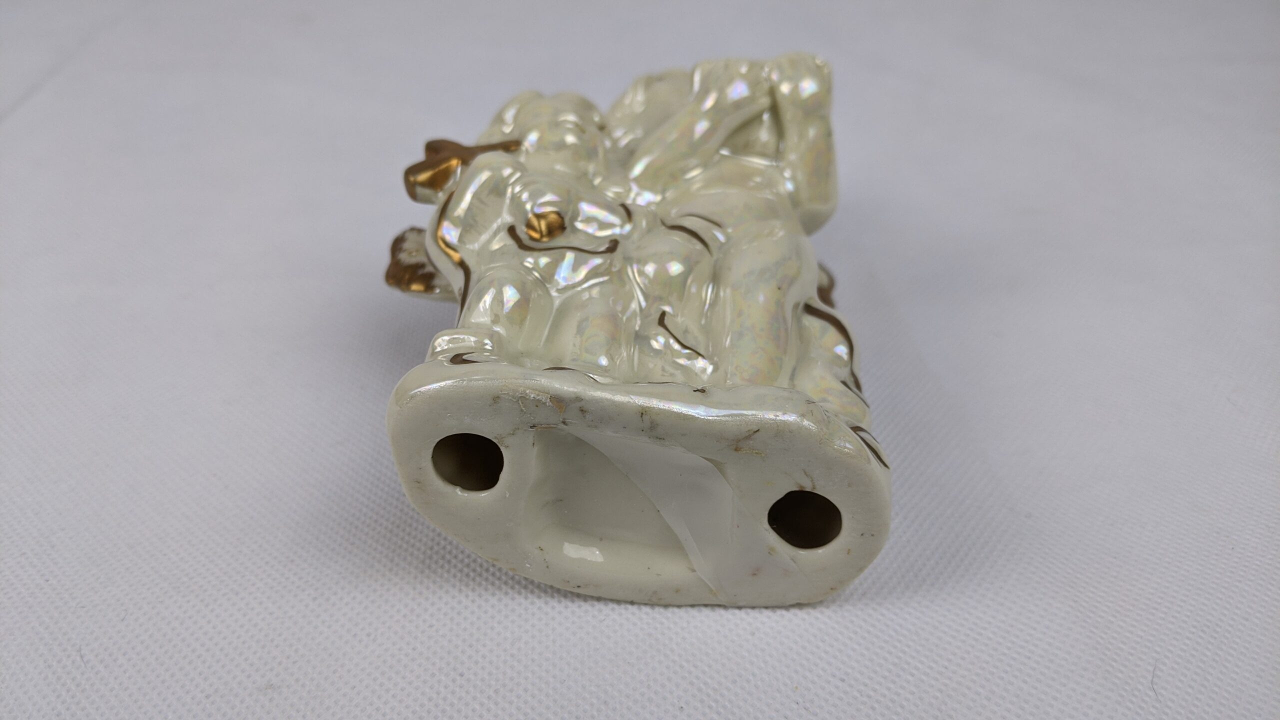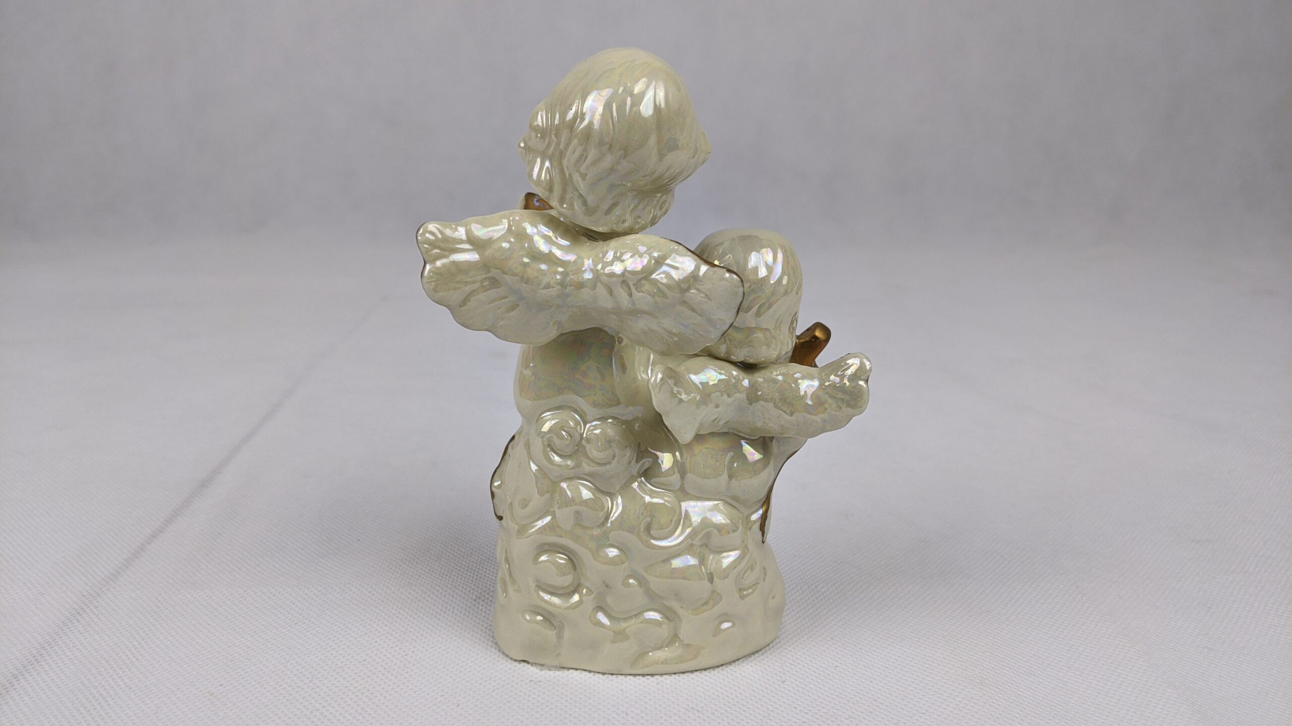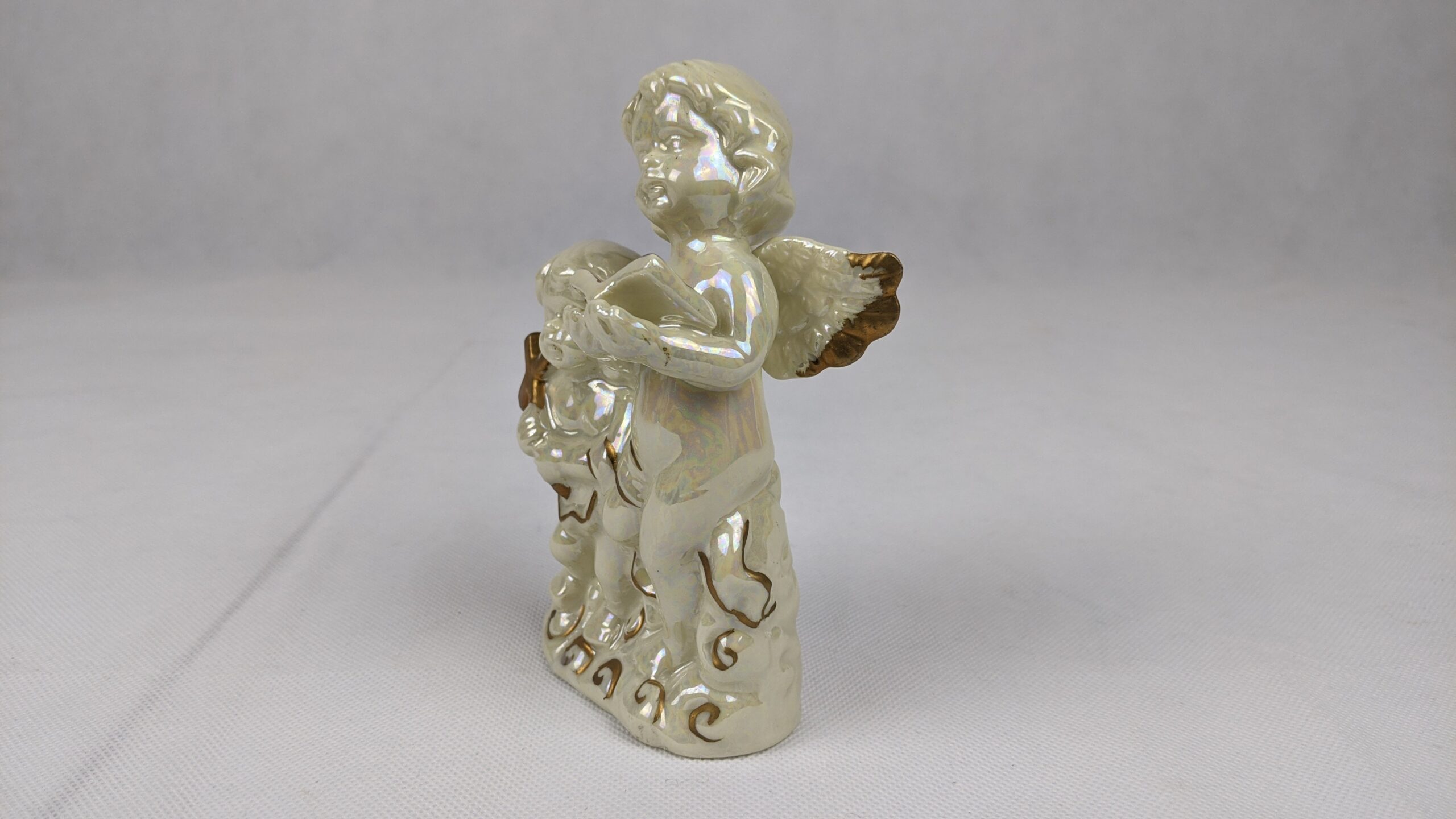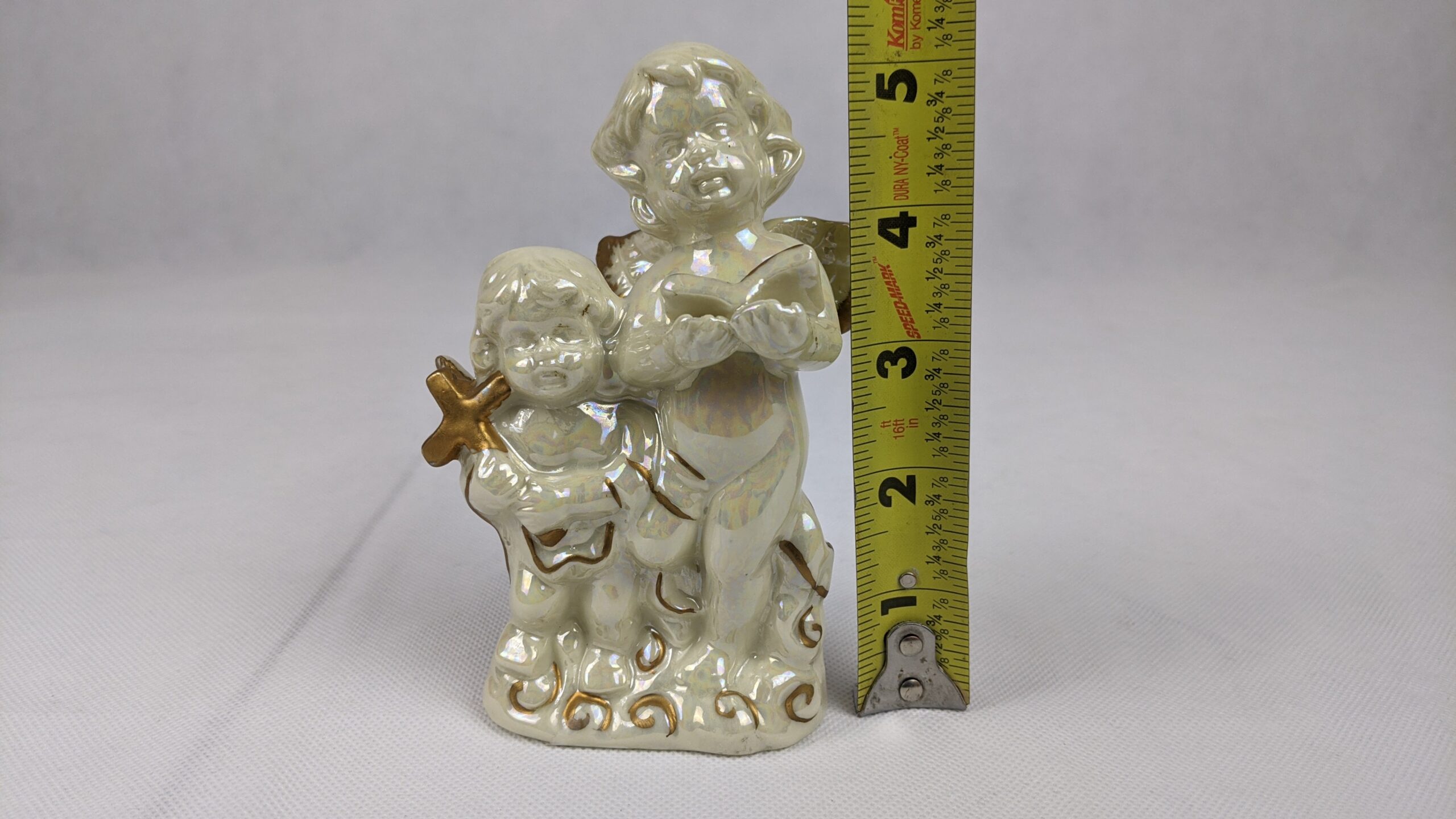 Glossy Angels Holding Bible & Cross is a very pretty item that has a lot of shine. It was a previously displayed item that is in good condition. It is approx. 5.25 inches tall.
