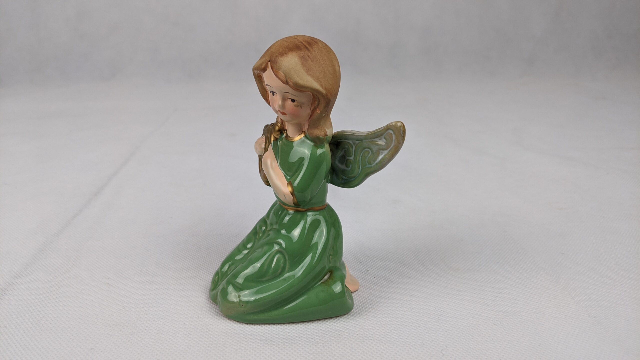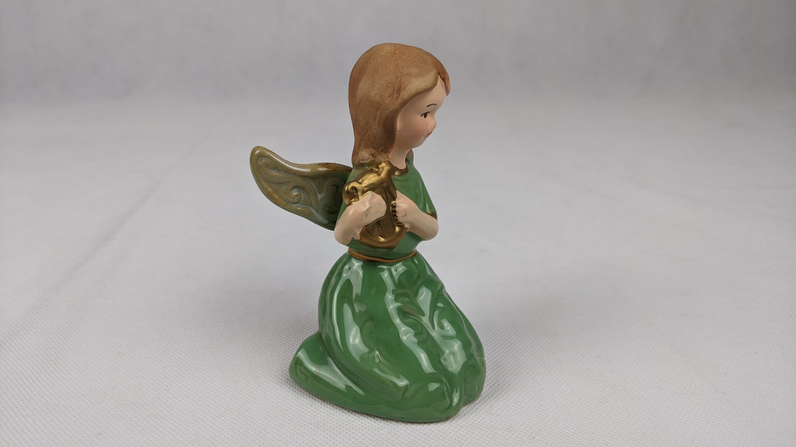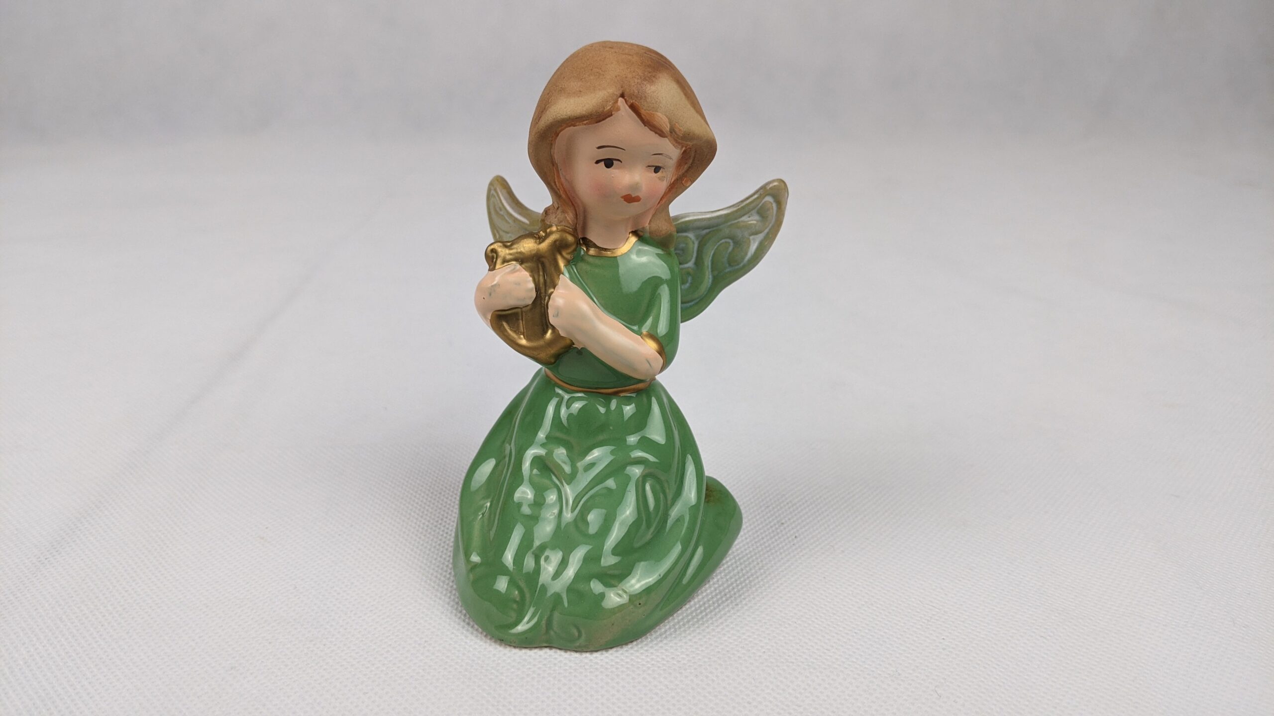 Green Dress Angel With Harp is a used item that has been previously displayed. It is very pretty piece that is in good condition.