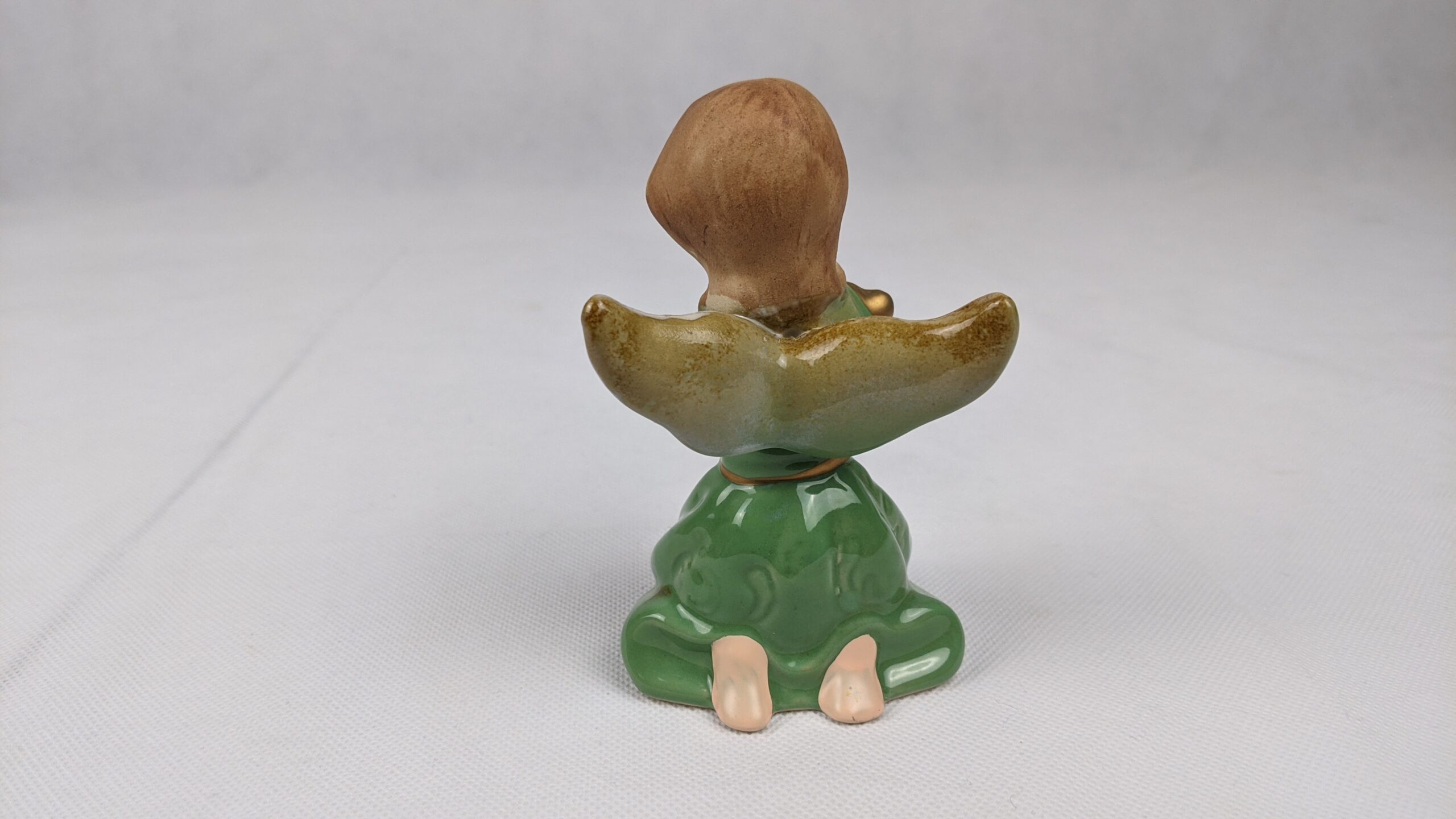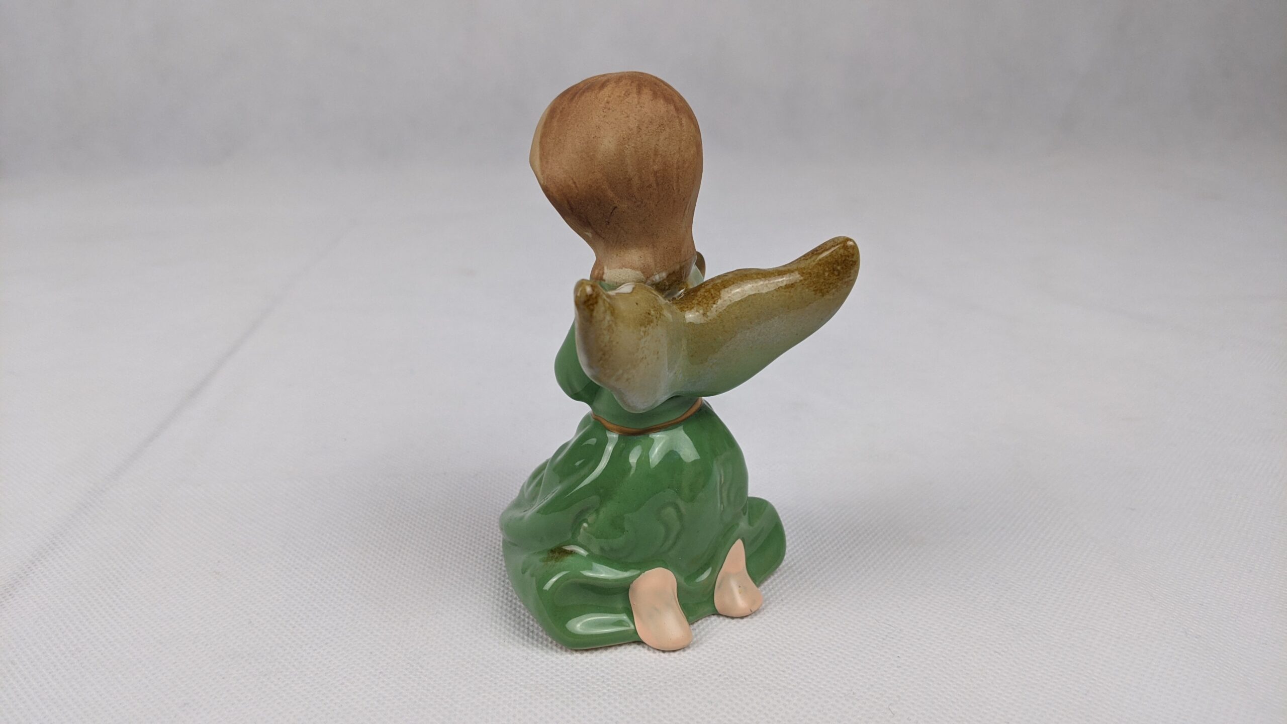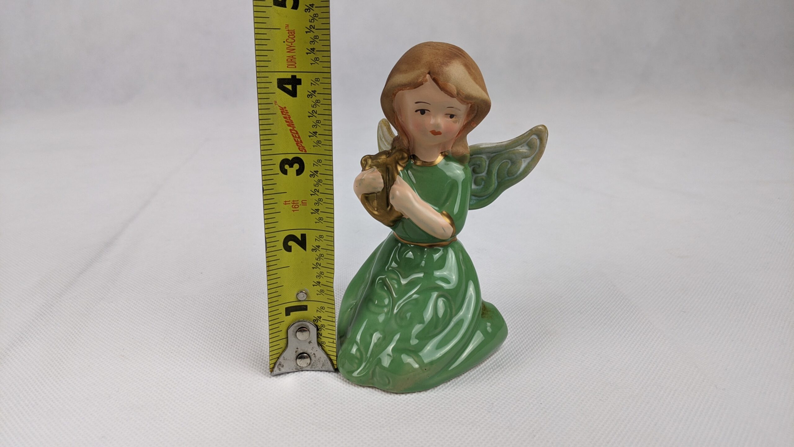 Green Dress Angel With Harp is a used item that has been previously displayed. It is very pretty piece that is in good condition.