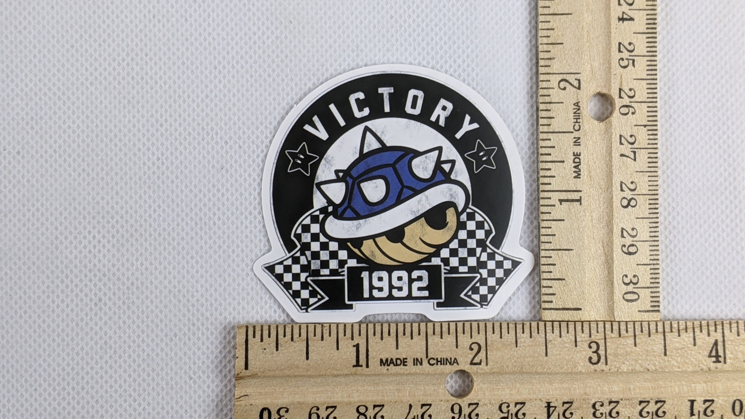 Victory 1992 Mario Cart is a new Vinyl Sticker. Great on laptops, lockers, skateboards, and whatever else you want to sticker.